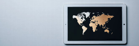 A sleek flat lay showcases a tablet with a detailed world map, designed for creative mock ups and promotional use with space for text.