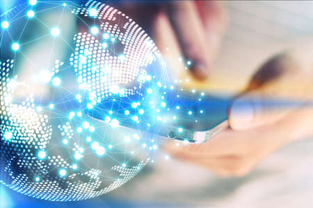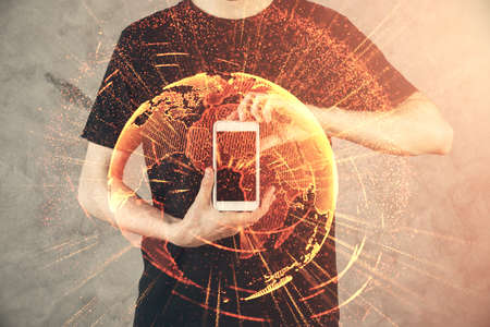 Close up of young man hand using global network app on a mobile phone with virtual screen background