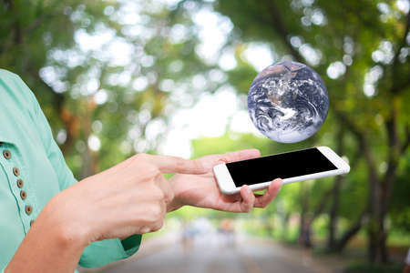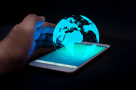 hand hold smart phone with globe - Elements of this image furnished by NASA