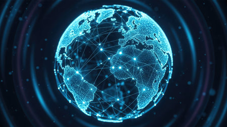 An illustration depicts a digital globe with interconnected nodes, radiating lines, and a dark blue background. The style showcases a network of connections and data flow, accentuated by bright blue lights. This visual could suit a variety of projects related to international communication, data sharing, or technological innovation. Suitable for editorial and commercial applications.