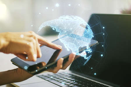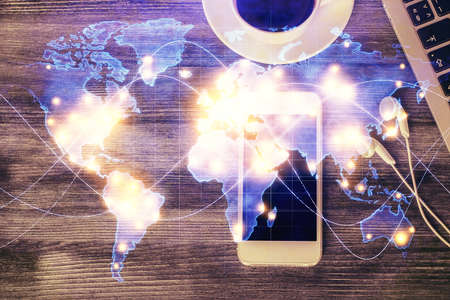 Double exposure of business theme hologram over desktop with phone. Top view. Mobile international trade connection concept.