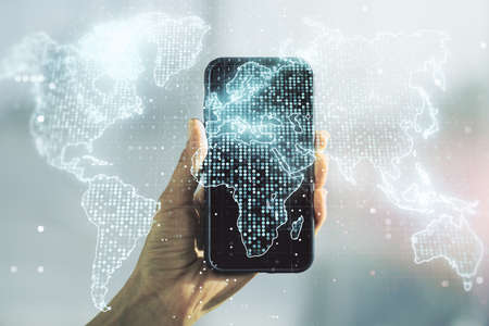 Multi exposure of abstract graphic world map and hand with mobile phone on background, big data and networking concept