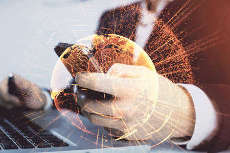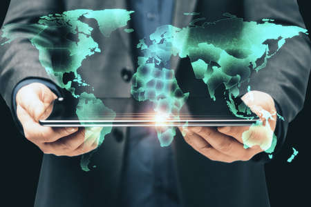 Multi exposure of man's hands holding and using a digital device and map drawing. International business concept.