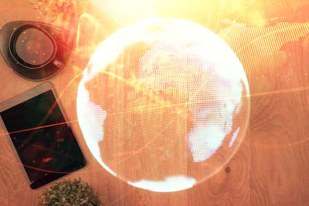 Multi exposure of technology theme drawing over work table desktop. Top view. Global data analysis concept.