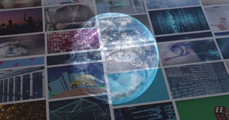 Abstract hi tech background with digital planet hologram and picture thumbnails. Concept of internet, communication and hi tech. Toned image double exposure