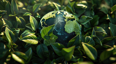 A vibrant earth globe rests among lush green leaves, symbolizing nature's beauty and the importance of environmental conservation in a thriving ecosystem.
