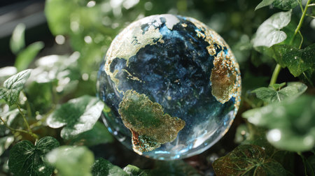 Crystal globe representing Earth is surrounded by lush green foliage, symbolizing nature and environmental awareness. globe features detailed continents and oceans, reflecting vibrant ecosystem