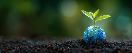 This captivating image features a small globe with a green tree emerging from the soil, symbolizing environmental growth and sustainability. The blurred background enhances the message of nurturing nature.