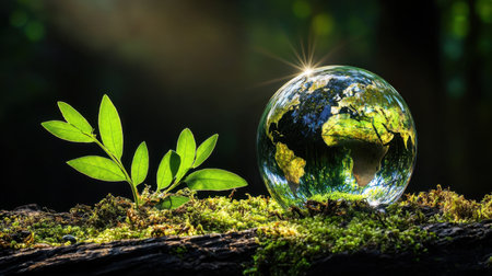 A stunning visual representation of the earth encapsulated in a crystal globe on a mossy surface, emphasizing the importance of nature and sustainability in our lives.