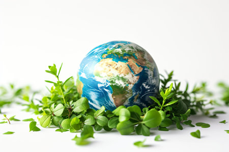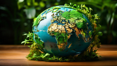 Stylized 3D rendering of a globe with green foliage, emphasizing global conservation with this inviting photo.