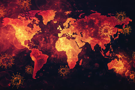 Map displays zones of epidemic outbreaks worldwide, emphasizing areas of high risk through distinctive coloration and virus markers.