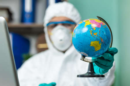 Disinfection man with special white suite holding globe earth with one hand at office