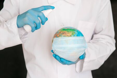The concept is to protect the planet from coronavirus. splash the antiseptic on the globe. Covid-19 and the globe in the hands of the doctor