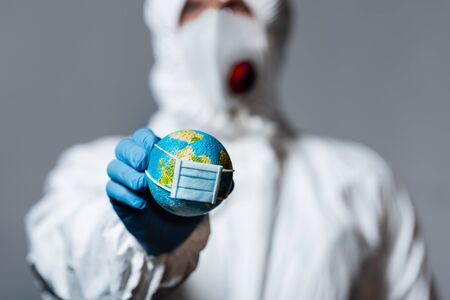 selective focus of man in hazmat suit holding small globe in medical mask isolated on grey