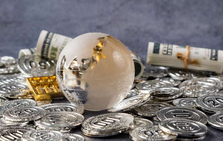The display features a collection of cash notes alongside coins and a small globe. This setup highlights the interconnectedness of global finance and economic activities.