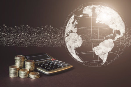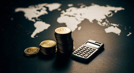 Close-up of stacked coins, a single coin, and a calculator on a dark surface with a blurred world map in the background.