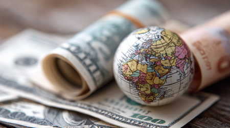 Macro shot featuring US dollar notes and a small globe, highlighting global financial