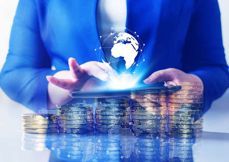 Coins Stack and calculator and virtual gologram of digital globe. Concept of money saving, financial. Global network. Business Growth concept. Financial risk