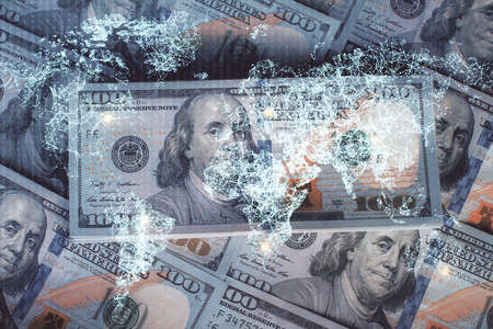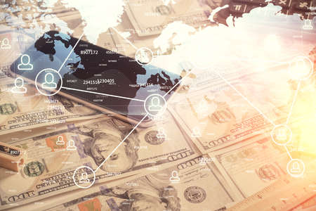 Multi exposure of social network drawing over us dollars bill background. Concept of people connection.
