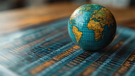 A visually engaging miniature globe rests on a backdrop of financial charts, symbolizing the intersection of geography and global business trends, capturing attention effectively.