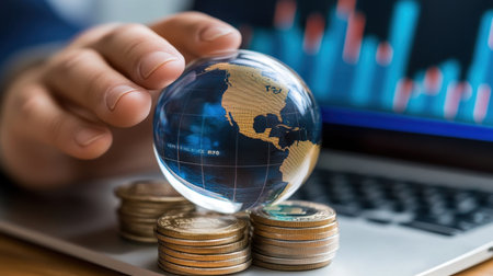 A person's hand holds a crystal globe above stacks of coins, symbolizing global finance. Financial charts on the laptop illustrate market trends and investment opportunities.