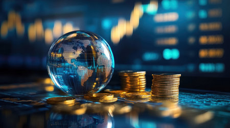 A captivating visual representation of global finance featuring a digital globe, stacks of coins, and financial charts, symbolizing the interconnectedness of the economy.