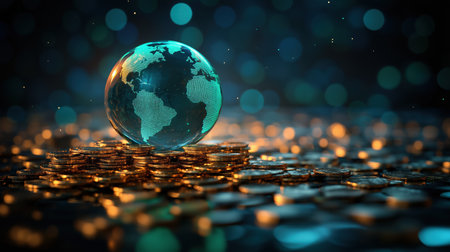 A captivating visual representation of global finance featuring a digital globe, stacks of coins, and financial charts, symbolizing the interconnectedness of the economy.