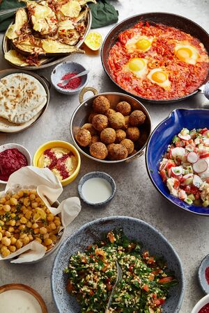 Overhead image of traditional jewish and middle eastern food: falafel, fattoush, tabouli, shakshuka, balila, hummus, roasted eggplants and spicy beetroot dip. Israeli cuisine concept
