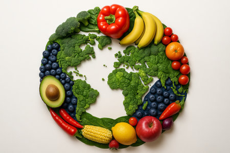 World map made of fresh fruits and vegetables arranged in globe shape. concept of healthy eating, sustainability, creative food art.