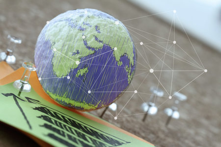 This image depicts planet Earth surrounded by interconnected lines, suggesting a global network. The illustration features vibrant blue and green colors, possibly representing data flow or communication. The composition is likely digitally created, with a dark background. It is suitable for projects related to technology, globalization, and information.