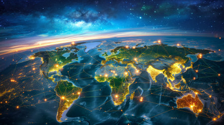 This stunning illustration showcases a detailed view of the earth with bright network lines illustrating global connectivity among cities at night.