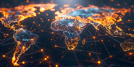 Abstract view of a global network with illuminated connections linking continents in warm tones