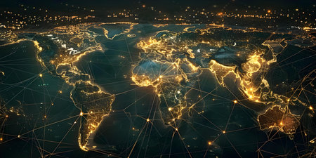 Aerial view of Earth at the night with glowing network connections, symbolizing global communication, .