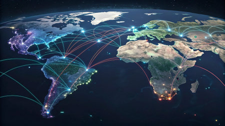A digital map illustrates connections across continents with illuminated lines and nodes representing data flow. This vibrant depiction emphasizes the interconnectivity of our global network.