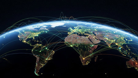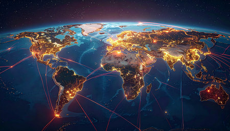 A captivating illustration of a global map showcasing illuminated lines that represent intricate connections and data flow across continents, emphasizing the theme of communication and technology.