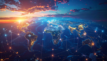 This stunning illustration features a world map illuminated with network connections that symbolize global communication. The dusk setting enhances the vibrant lights of cities, highlighting the interconnectedness of our modern world.