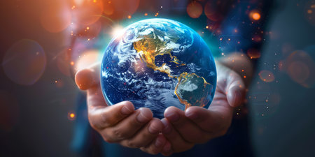 Hands cradle a radiant Earth, symbolizing global care and responsibility towards our planet and future generations