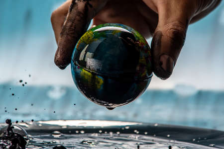 Soiled man's hand is pulling the Earth in the form of a globe out of the oil. Concept of saving the planet, using natural resources and harming the environment