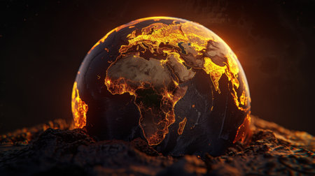 Glowing Earth with fiery continents and dark, textured surface creates dramatic visual. image evokes sense of urgency about climate change and planet future