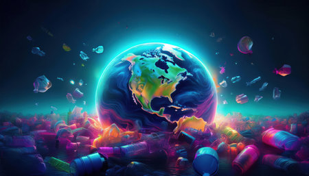 Vibrant depiction of Earth surrounded by waste, emphasizing the importance of recycling efforts.