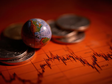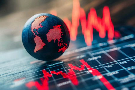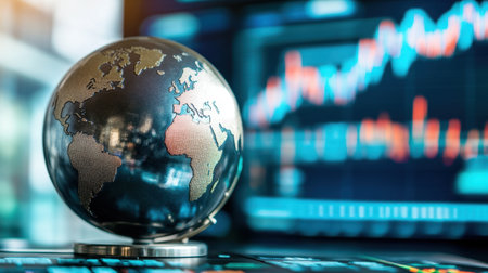 A detailed close-up image of a metallic globe resting on a desk, with a vibrant stock market graph displayed in the background, symbolizing global finance.