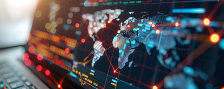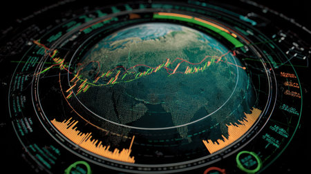 Dynamic visual representation of business finance data, showcasing stock charts and a globe. Perfect for illustrating investment strategies and market trends.