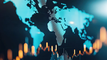 This image showcases a colorful visualization of global market trends over a world map, ideal for financial analysis and technology themes, illustrating data and growth patterns.