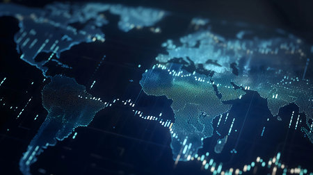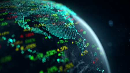This dynamic image presents a global perspective of financial data, showcasing stock market trends and economic activity in a vibrant, colorful design.