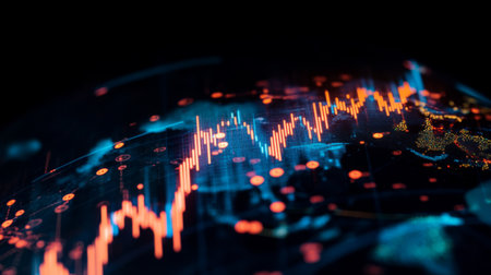 A visually striking abstract representation of global market trends, showcasing dynamic data visualizations with glowing orange graphic elements against a dark background.