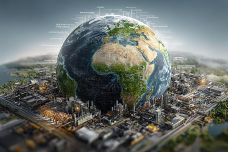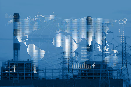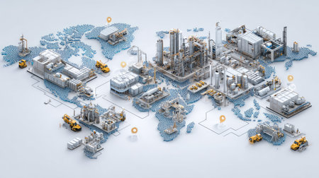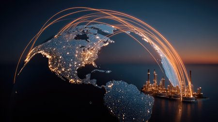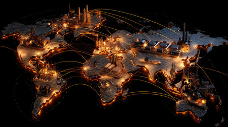 Detailed illustration of a world map showcasing global energy infrastructure with illuminated industrial sites, representing modern connections and energy flow.