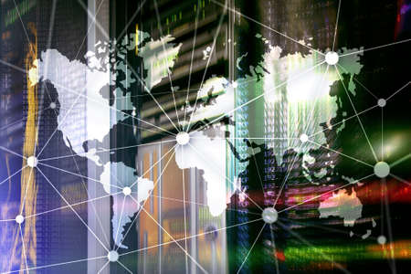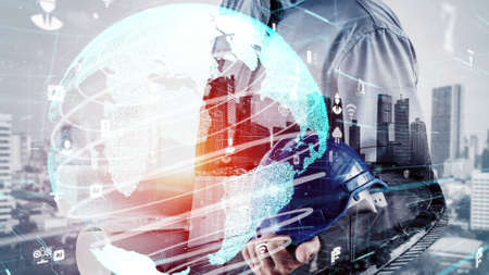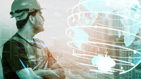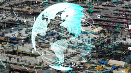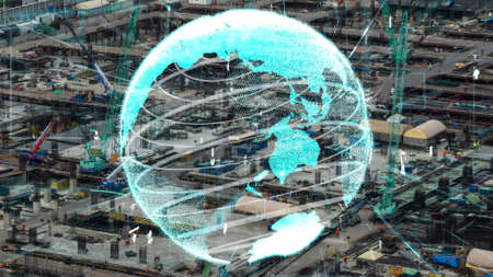 Double exposure global connection line and industry construction site.