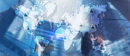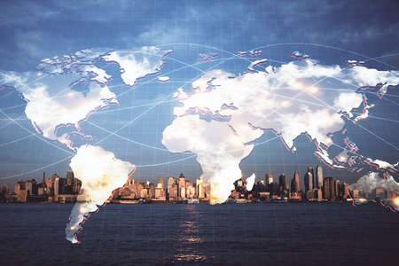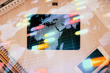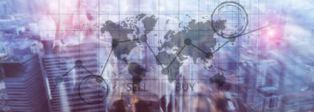 Double exposure world map. Global business and financial market concept.