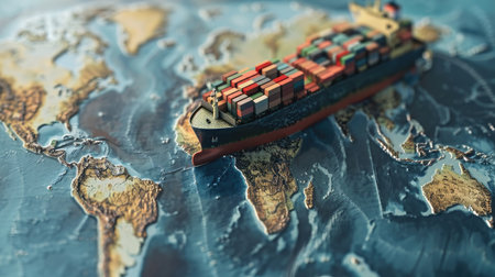 Container ship on a world map, illustrating global trade routes and transportation, with clear copy space for messages.