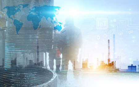 Future factory plant and energy industry concept in creative graphic design. Oil, gas and petrochemical refinery factory with double exposure arts showing next generation of power and energy business.